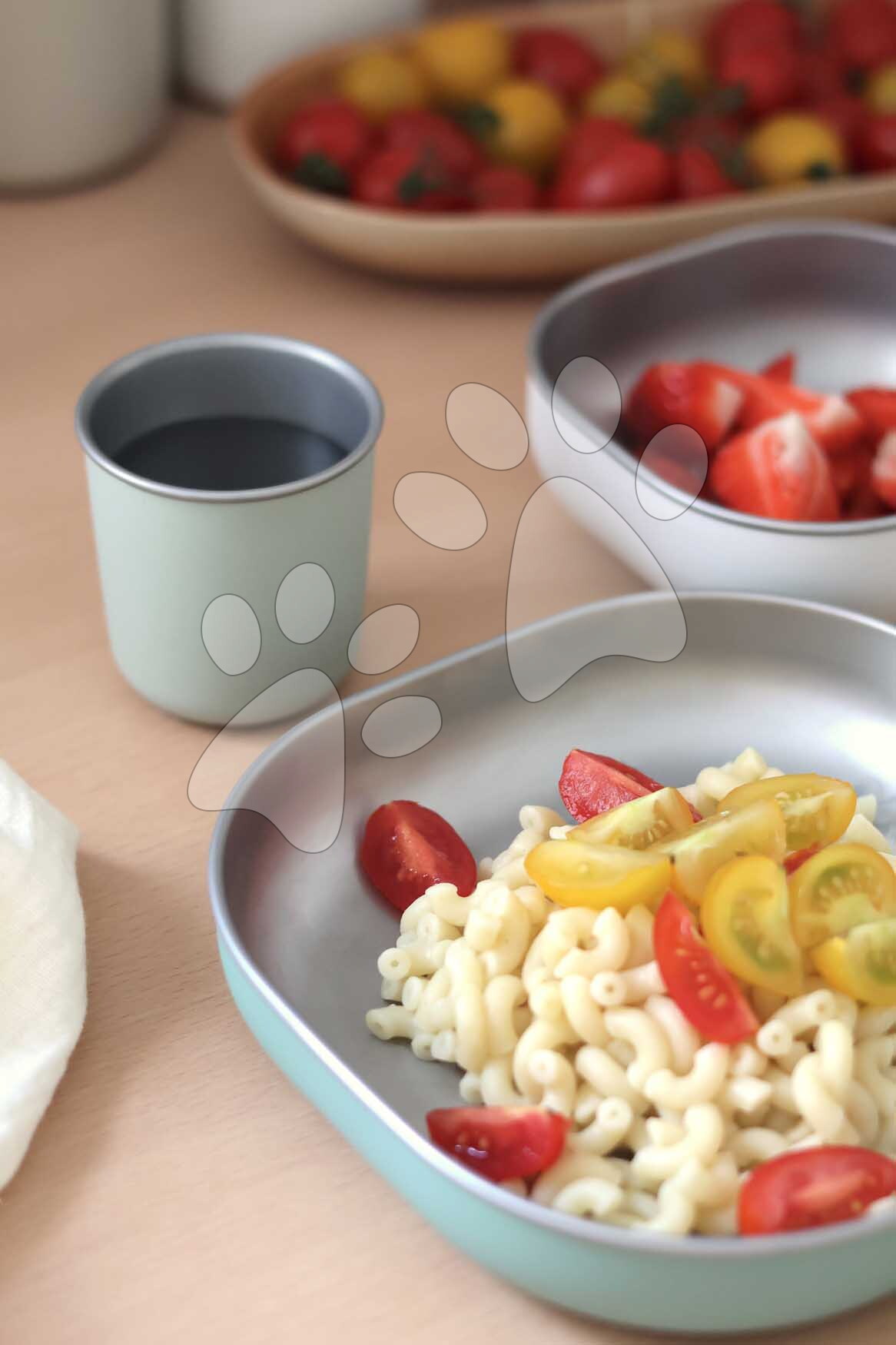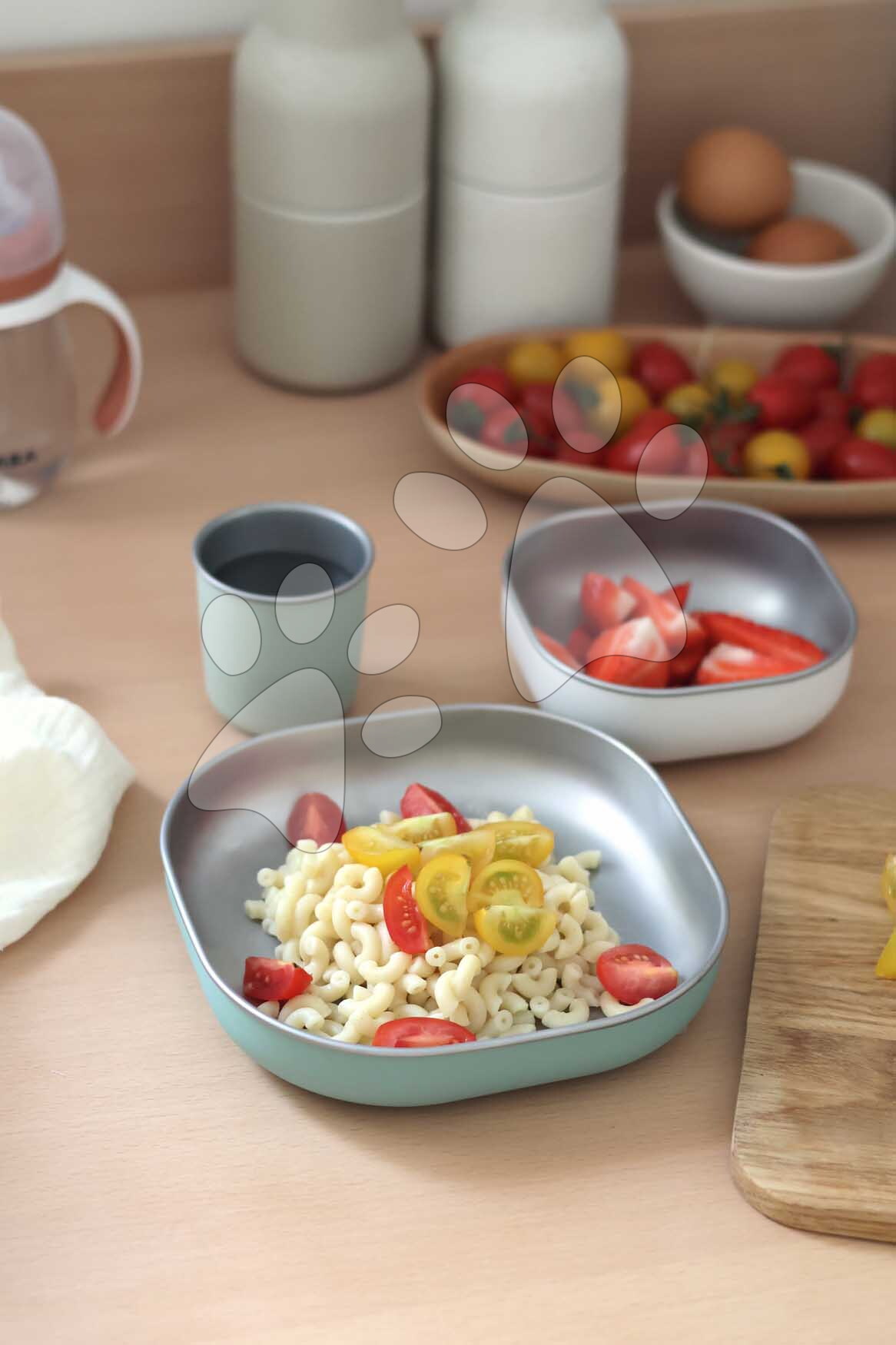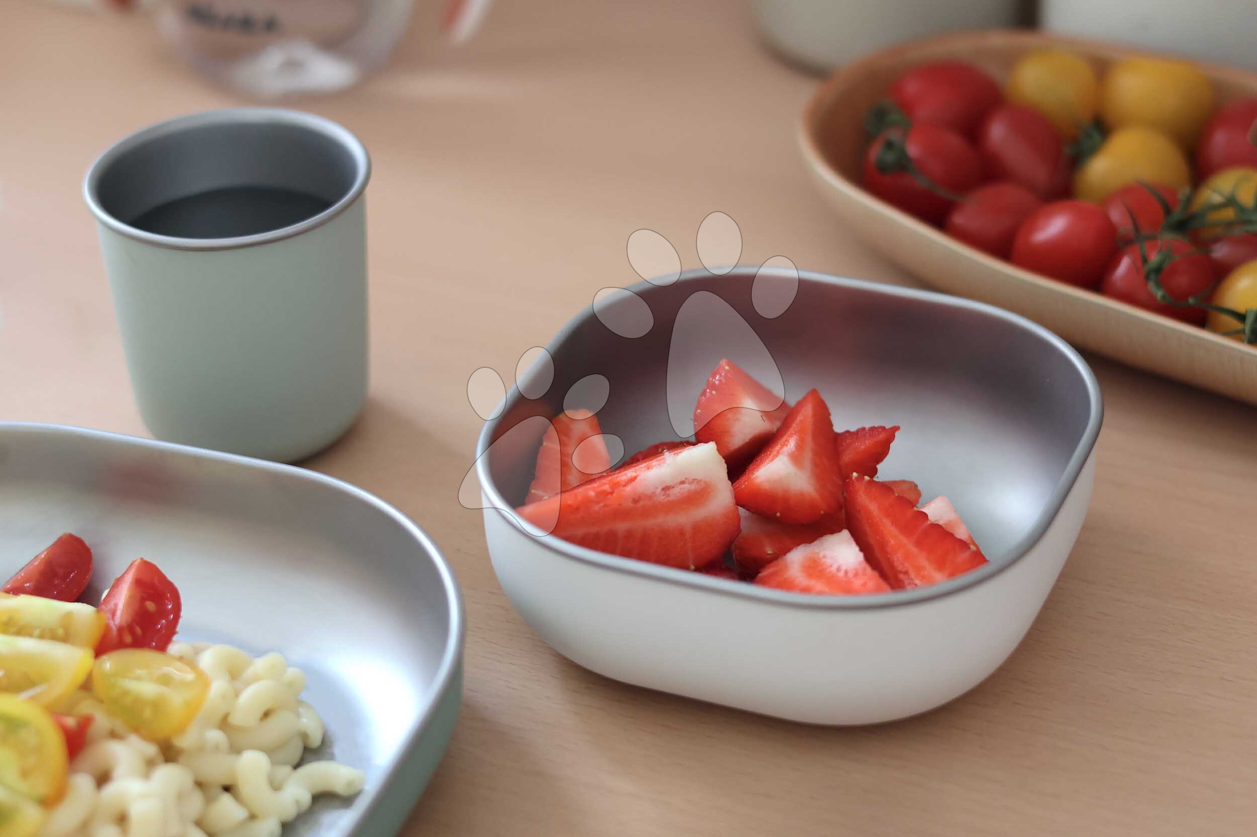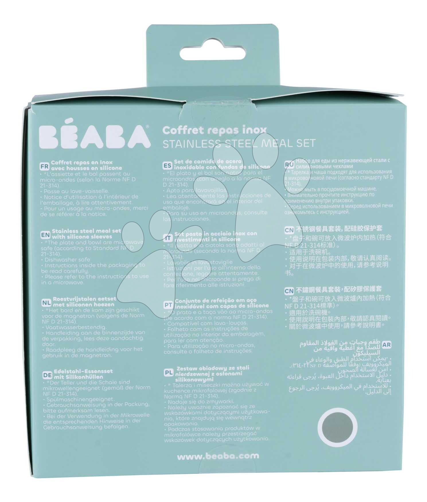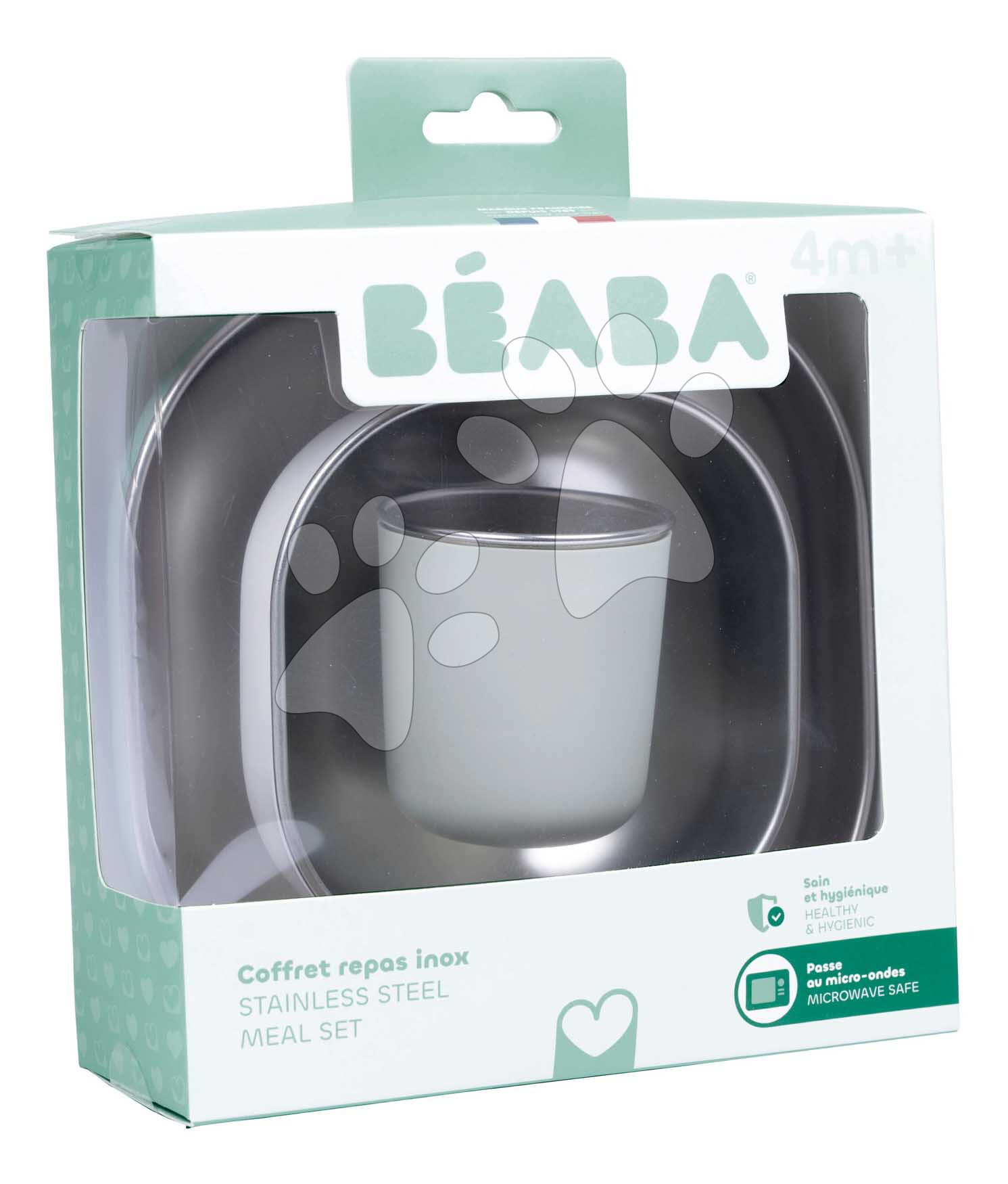 Celá jedálenská súprava je vyrobená z nehrdzavejúcej ocele bez chemikálií a neovplyvňuje chuť ani vôňu jedla. Riady majú silikónovú povrchovú úpravu, vďaka čomu nekĺžu po stole a deťom tak jednoducho nevypadnú z rúk. Oblé a vyvýšené tvary detských riadov zabezpečia jednoduché naberanie jedla a radosť zo samostatného jedenia bude o to väčšia. Nerezová jedálenská súprava Beaba je ľahká a nerozbitná a je vhodná do mikrovlnnej rúry, umývačky riadu, chladničky a môžete ju vložiť aj do klasickej rúry vyhriatej maximálne na 180°.