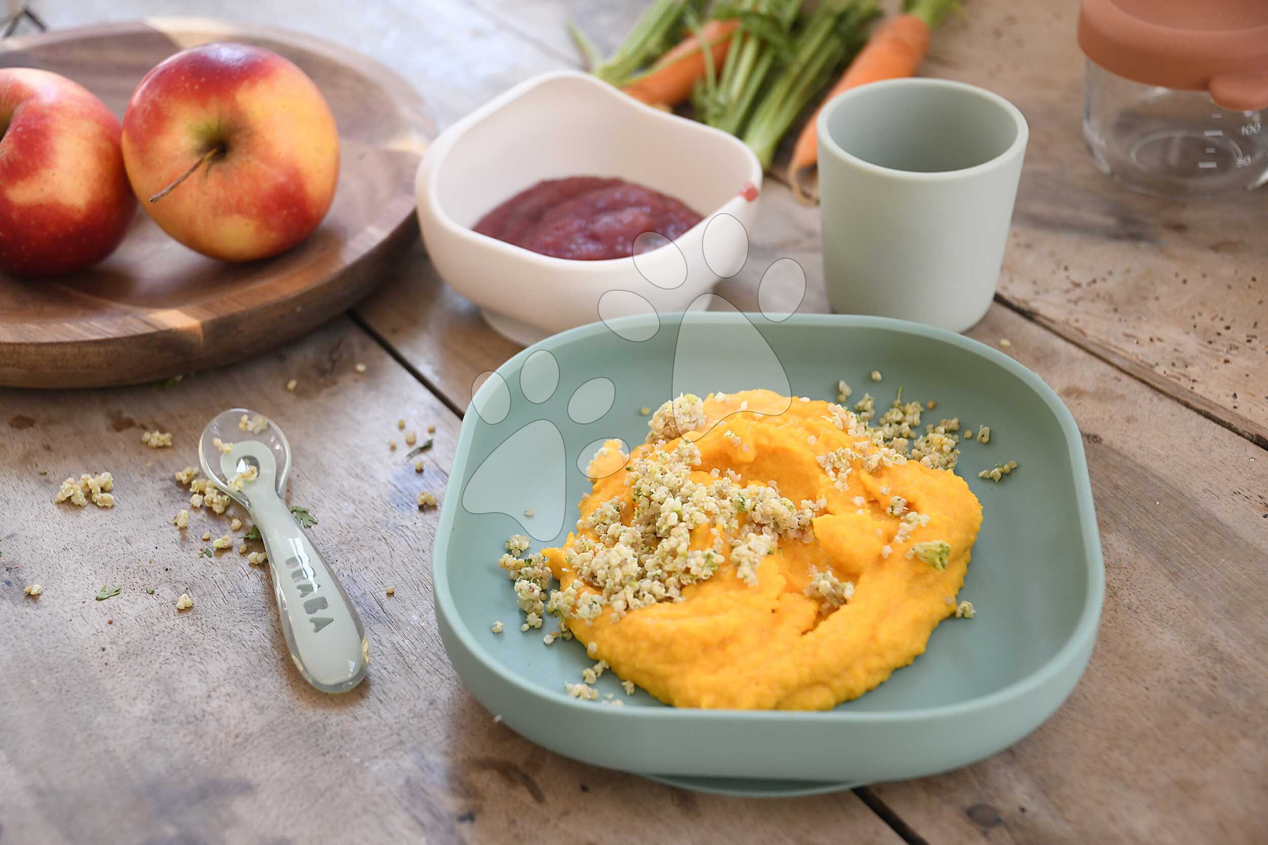 Jedálenská súprava Beaba je špeciálne navrhnutá pre potreby detičiek, ktoré začínajú samostatne jesť a je vhodná pre bábätká už od 4 mesiacov. Rodičov určite poteší integrovaná prísavka na tanieri a miske, ktorá pomôže predchádzať nehodám a riady udrží pevne na stole alebo jedálenskej stoličke. Celá jedálenská súprava je vyrobená z vysokokvalitného potravinárskeho silikónu, ktorý je mäkký, flexibilný, nerozbitný a neobsahuje BPA, PVC ani ftaláty. Silikónovú jedálenskú súpravu môžete umývať ručne použitím špongie alebo v umývačke riadu a je vhodná aj do mikrovlnnej rúry.