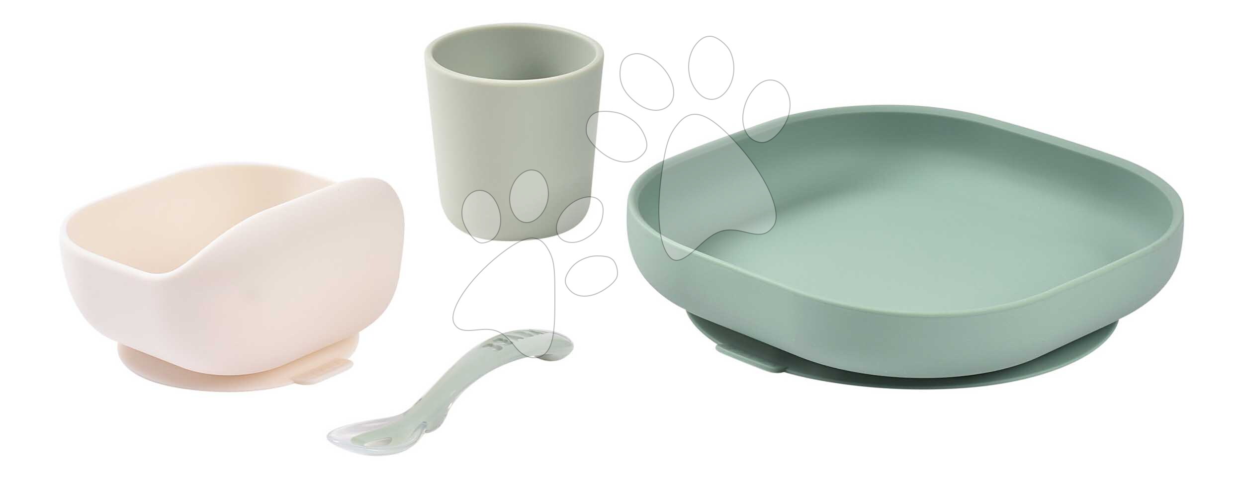 Jedálenská súprava Silicone Meal Set Sage Green Misty Green z dielne francúzskej značky Beaba sa okamžite stane nevyhnutnou súčasťou stolovania s bábätkom. Štvordielna jedálenská súprava v odtieňoch zelenej pozostáva z hlbokého taniera, misky, pohára a tréningovej lyžičky 2nd age. Ergonomický dizajn detského riadu uľahčuje samostatné kŕmenie a miska s vysokým zaobleným okrajom pomáha dieťaťu ľahšie nabrať jedlo do lyžičky, takže pokusy o prvé samostatné jedenie nebudú frustrujúce. Tréningová lyžička s krátkou ergonomickou rúčkou sa dokonale hodí do rúk vášho dieťatka a jej tvar je prispôsobený malým detským ústam.