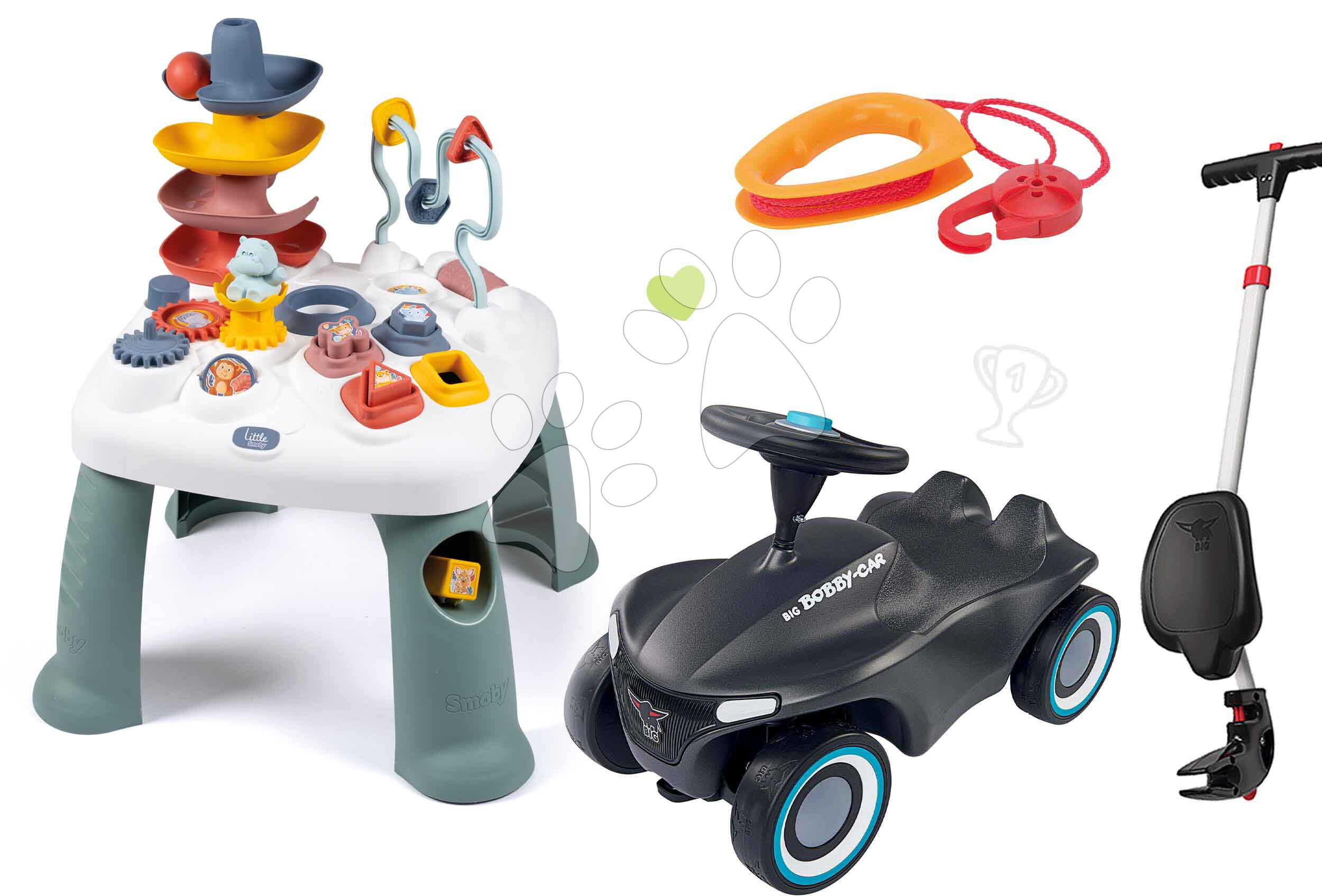 Didaktický stolík Activity Table a odrážadlo s vodiacou tyčou a vodítkom na ťahanie predstavujú skvelú sadu hračiek pre deti od 12 mesiacov. Hračky v sete spolu farebne a dizajnovo ladia, ozdobia každú detskú izbičku. Hračky od francúzskeho výrobcu Smoby a nemeckého BIG dokážu hravým spôsobom všestranne rozvíjať schopnosti detí. Vaši najmenší sa môžu tešiť na rôzne zábavné aktivity s didaktickým stolíkom, ktorý rozvíja ich kognitívne schopnosti, jemnú motoriku a logické myslenie. O skvelé športové zážitky sa postará odrážadlo so zvukom a príslušenstvom pre maximálny komfort dieťaťa.